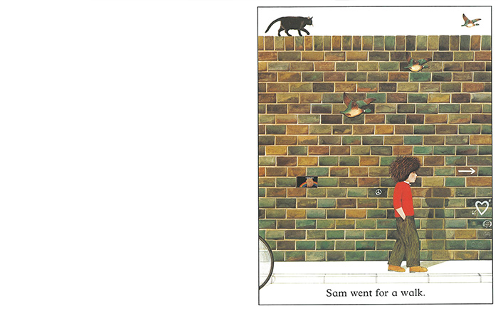 ¼û°ÜÁø ±×¸², ´Ù¾çÇÑ È­¸é ±¸¼º Anthony BrowneÀÇ ÀÛǰ´ä°Ô ¼û°ÜÁø ±×¸²µéÀÌ ¸¹½À´Ï´Ù. ¼Ó´ã, ¡®Walls have ears.¡¯¶ó´Â ¸»À» ¶°¿Ã¸®°Ô ÇÏ´Â º®¿¡ ºÙ¾îÀÖ´Â µÎ ±Í¿Í »¡·§ÁÙ¿¡ °É¸° ä ¼Ò¸Å¸¦ ¸ÂÀâ°í ÀÖ´Â ¼ÅÃ÷, Áý ¾È¿¡¼­ ²ÉÀ» ¸Ô´Â ¼Ò, °ø ¿øÀÇ ¹°°í±â ±×¸®°í ¿ì½º²Î½º·± »¡·¡µé±îÁö ÀÛ°¡ÀÇ ±Øµµ·Î ¼¶¼¼Çϸ鼭µµ ÀÚÀ¯ºÐ¹æÇÑ À¯¸Ó¸¦ ¸¾²¯ Ç¥ÇöÇÏ¿´½À´Ï´Ù. ÆäÀÌÁö¸¶´Ù ´Ù¸£°Ô ±¸¼ºµÈ ´Ù¾çÇÑ È­¸éµµ »©³õÀ» ¼ö ¾ø´Â º¼°Å¸®ÀÔ´Ï´Ù. »¡°£ º®µ¹Áý Àå¸é¿¡¼­´Â ¾çÂÊ ÆîÄ£ ÆäÀÌÁö¸¦ »ç¿ëÇØ °ø°£°¨À» Àß »ì·È°í, ±×¸² ¹Û¿¡¼­ ÀϾÀ» »ç°í Àå¸éÀº ¾ÆÀ̵éÀÌ »ó»óÇÒ ¼ö ÀÖµµ·Ï ó¸®ÇÏ¿´½À´Ï´Ù. °ø¿ø¿¡¼­ÀÇ Ã౸ Àå¸éÀº ¸¸È­Ã³·³ ³× ÄÆÀÇ ±×¸²À¸·Î ±¸¼ºÇÔÀ¸·Î½á º¸´Ù ´Ùä·Ó°í ¿ªµ¿ÀûÀÎ È­¸éÀ» ¿¬ÃâÇϰí ÀÖ°í º¸ÀÏ µí ¸» µí ¼ö¸¹Àº µ¿¹°µéÀÌ ¼û¾îÀÖ´Â ½£¿¡ ¼Ò³âÀÌ È¦·Î ³²Àº ¸¶Áö¸· Àå¸éÀº ¹Ì¹¦ÇÑ ¿©¿îÀ» ÁÝ´Ï´Ù. ¾ÆÀ̵éÀÌ °ø°¨ÇÒ ¼ö ÀÖ´Â ±×µé¸¸ÀÇ ³»¸é¼¼°è¿Í °¥µîÀ» ±íÀÌÀÖ°í Àç¹ÌÀÖ°Ô ±×·Á³½ À̾߱âÀÔ´Ï´Ù.