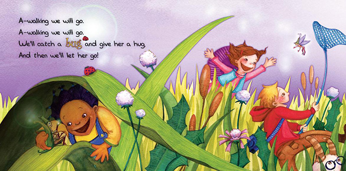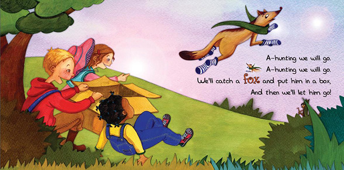 IntroductionThis folk song about hunting animals and insects in the field will delight young readers. The playful mood of the words, music, and pictures will bring out smiles and giggles.